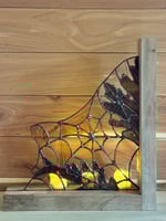 This handcrafted stained glass corner panel weaves together rich amber tones, delicate oak leaves, and a shimmering spider web β capturing the quiet beauty of fall. Framed in natural wood, it brings a cozy, woodland charm to your shelf or window.