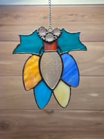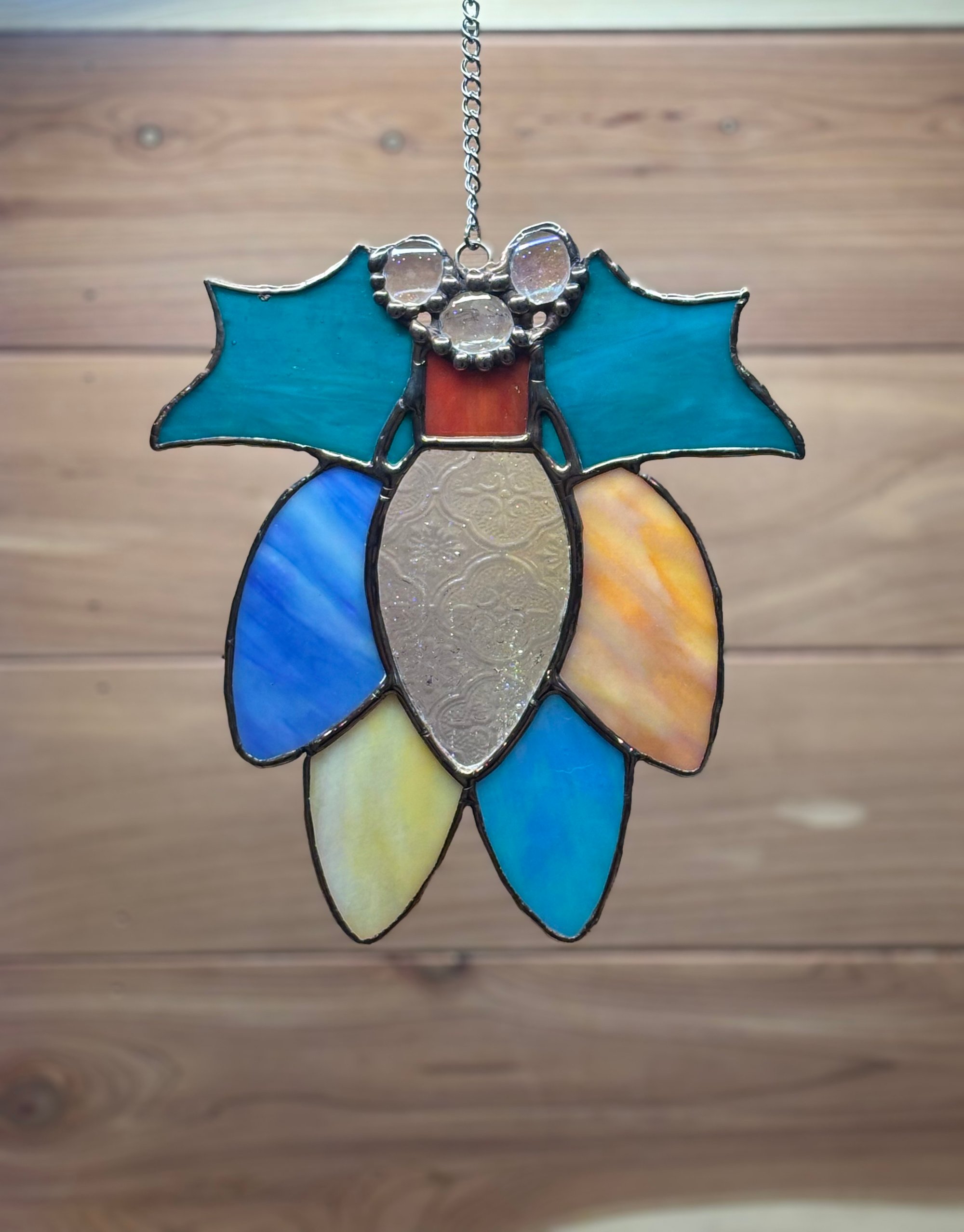 Handcrafted stained glass Christmas light with holly leaves — a vibrant mix of teal, amber, blue, and golden glass that sparkles with festive cheer. Hang it in a sunny window to let the colors glow and bring a touch of holiday magic all season long. 🎄✨