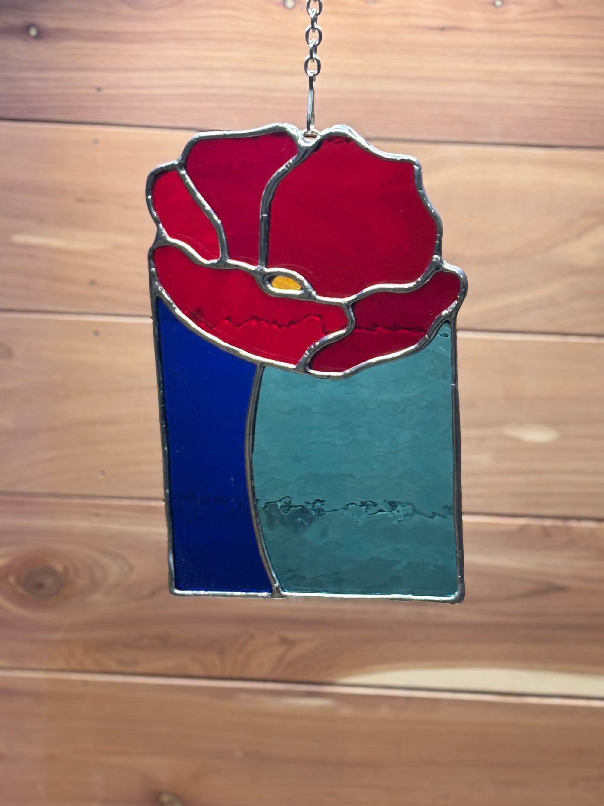 This handcrafted stained glass suncatcher features a bold red poppy set against serene teal and deep blue panels — a striking balance of color and calm. Each piece is carefully cut, soldered, and polished to catch the light beautifully. Perfect for gifting or adding a touch of artistry to your own window. 🌿