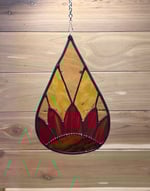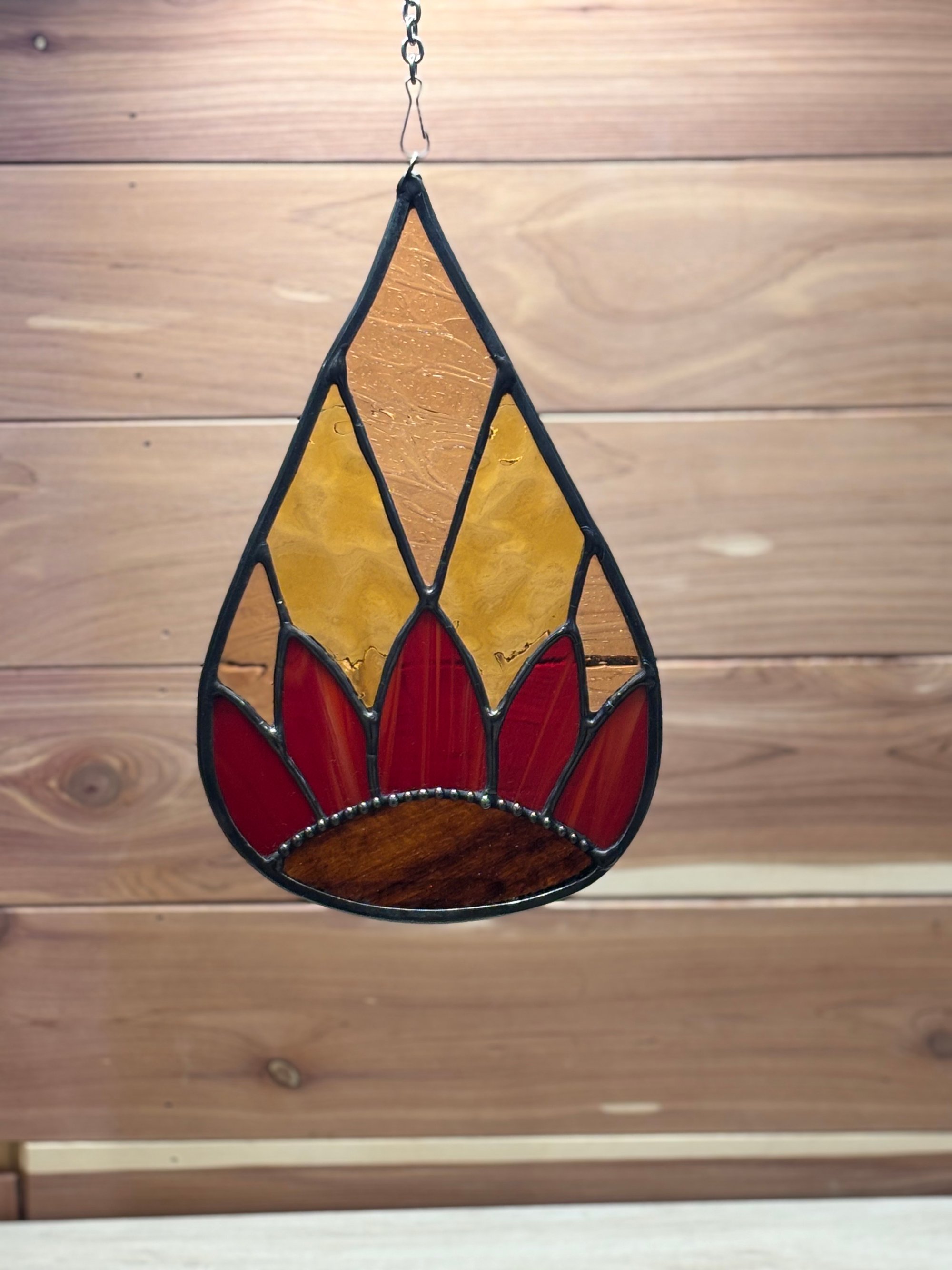 This handcrafted stained glass suncatcher captures the warmth of the sun in rich amber, deep red, and earthy brown hues. Its teardrop shape and petal design reflect both natureβs grace and fiery strength β a perfect balance of warmth and elegance. Hang it where the light can dance through and bring a golden glow to your space.