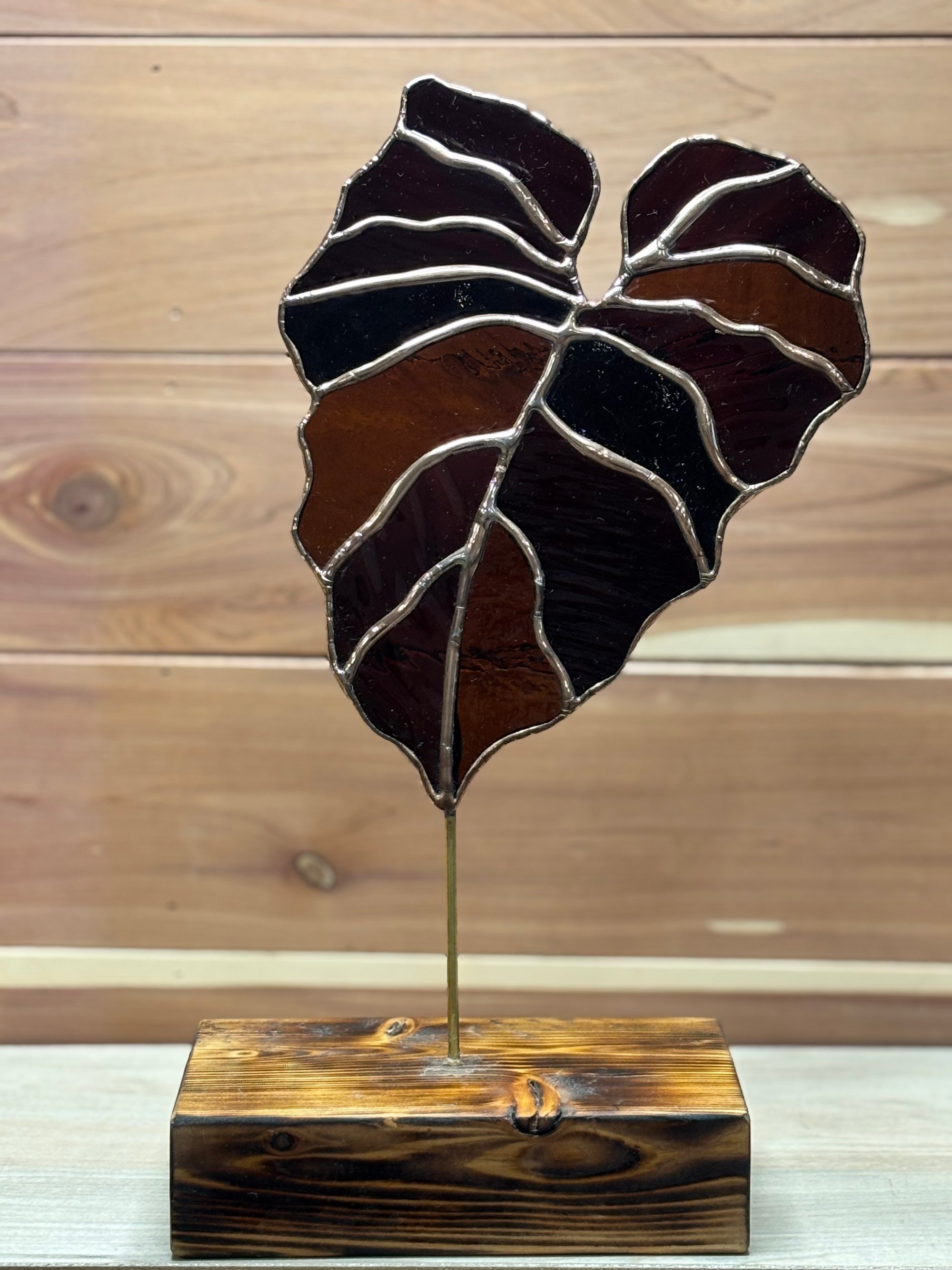 This handcrafted stained glass leaf sculpture brings a bold touch of nature indoors. Deep plum and amber tones shimmer against soft silver lines, all rooted in a rustic wood base. Elegant and earthy, itβs a statement piece that catches the light β and every eye.